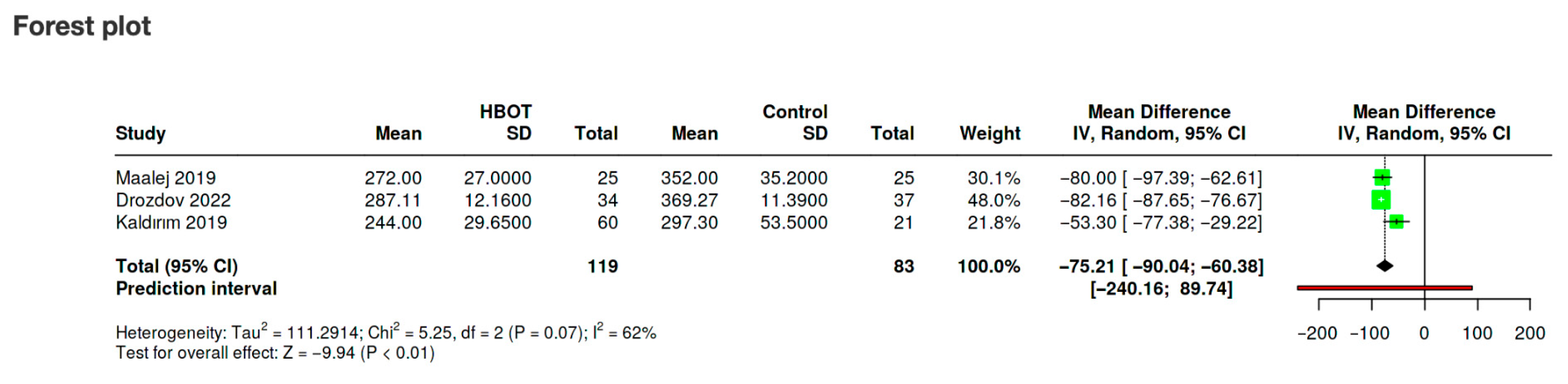 Figure 6. Forest plot—Hyperbaric oxygen therapy vs. control for CMT. Maalej et al., 2019 [25]; Drozdov et al., 2022 [8]; and Kaldirim et al., 2019 [26].