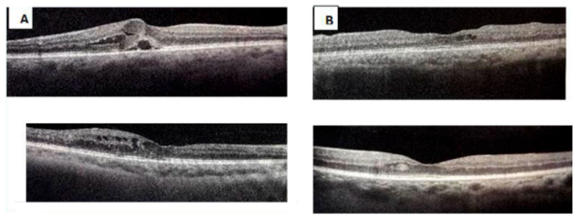 Figure 8. Improvement of the diabetic macular edema after HBOT. (A) Macular OCT scans before HBOT. (B) Macular OCT scans after HBOT [25].