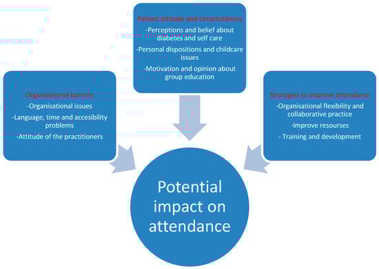 The demographic shift in the incidence and prevalence of diabetes requires evolution of care that can meet the needs of the affected people. Addressing the knowledge gap by providing structured patient education may help, but attendance is required to unlock new thinking about diabetes self-management. While the evidence has shown the negative impact of non-attendance in diabetes education centres, the perceptions of practitioners in the primary care settings in the UK remain underexplored. All the participants were female, and this reflects the demography of General Practice nurses in the United Kingdom. They all had over ten years working experience, which has a positive implication for the outcome of the study in terms of their clinical experience. The findings of this study revealed three main themes: organisation of care, personal circumstances, and attitudes of patients to diabetes education, coupled with strategies to aid attendance (Table 1).