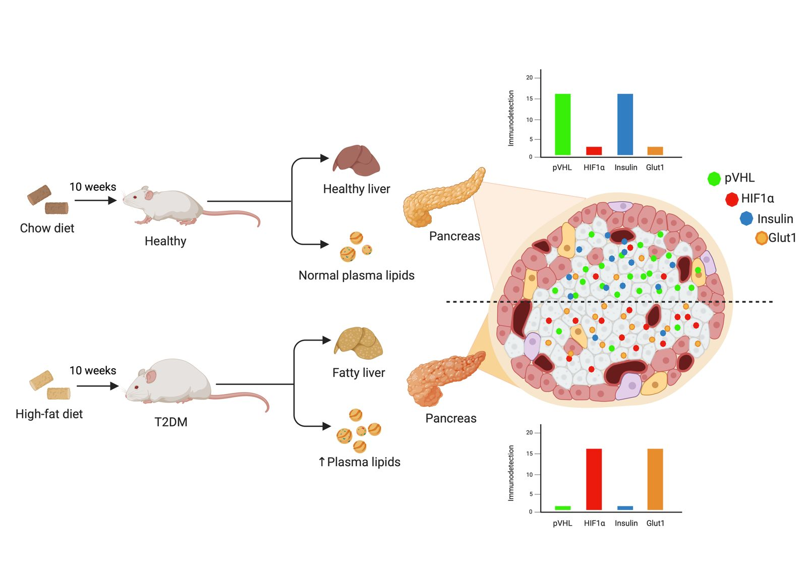 In conclusion, T2DM induced by a high-calorie diet in mice causes low expression of pVHL in the pancreatic islets of C57BL/6 and BALB/c mice, supporting the finding of pVHL knock-out mice in the pancreas. Furthermore, low expression of pVHL is a possible mechanism for the development of DM in mice and has therapeutic prospects.