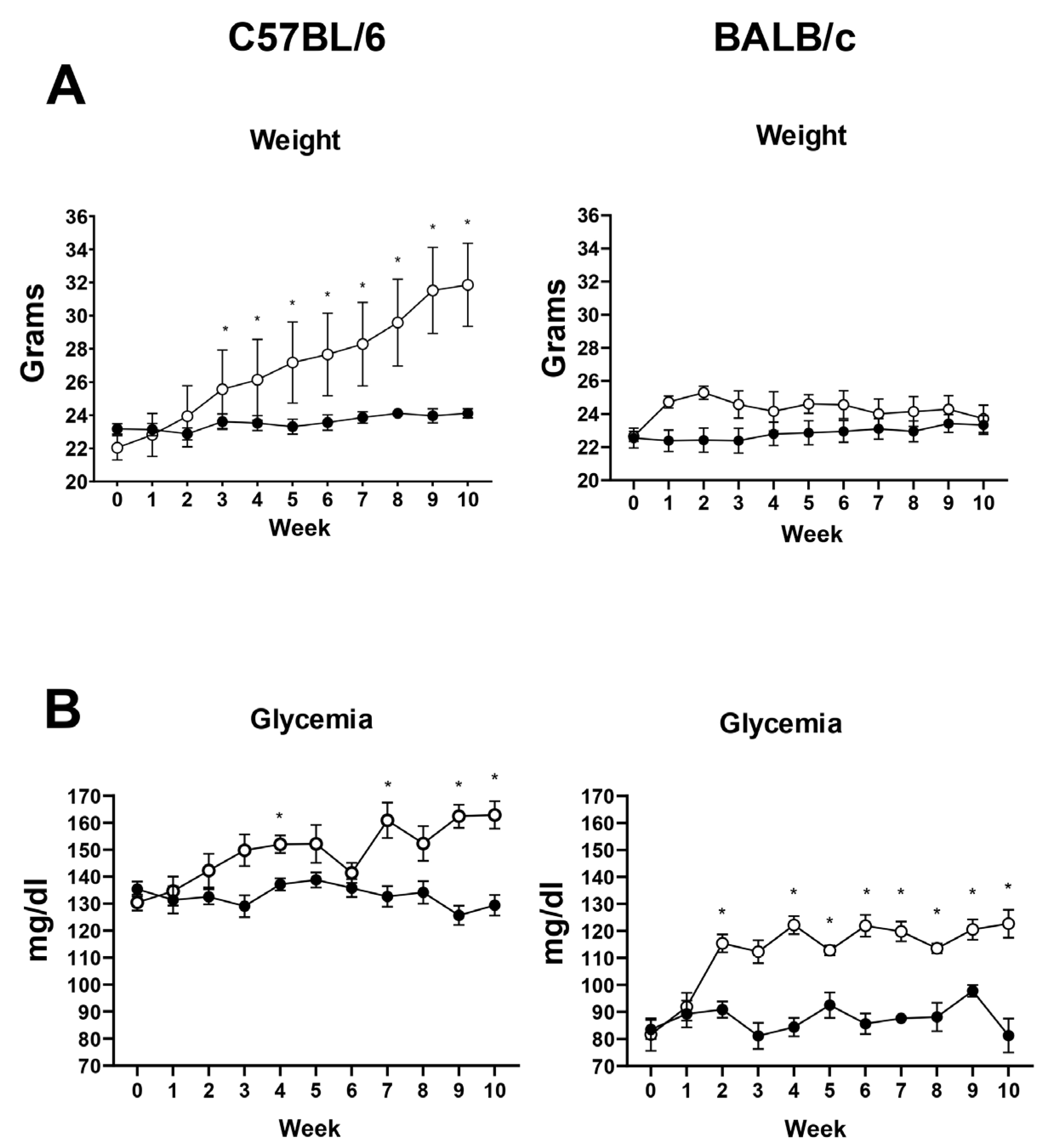 Figure 1. Body weight and blood glucose levels of mice fed a high-calorie diet (HCD). Mice from the C57BL/6 and BALB/c strains were given either a high-calorie diet (HCD) or a standard diet (SD) for 10 weeks. Weight (A) and blood glucose levels (B) were measured weekly. In all panels, data from mice fed the HCD are shown as white circles, while data from mice fed the SD are shown as black circles. Eight mice per group and strain (experiment 3) were tested. The asterisk indicates a significant difference based on an ANOVA two-way or mixed-model test as appropriate * = p < 0.05. For weight: Week factor p < 0.0001, Week × Diet p < 0.000, interaction p < 0.0001. For glycemia: Week factor p < 0.01, Week × Diet p < 0.001, interaction p < 0.0001.
