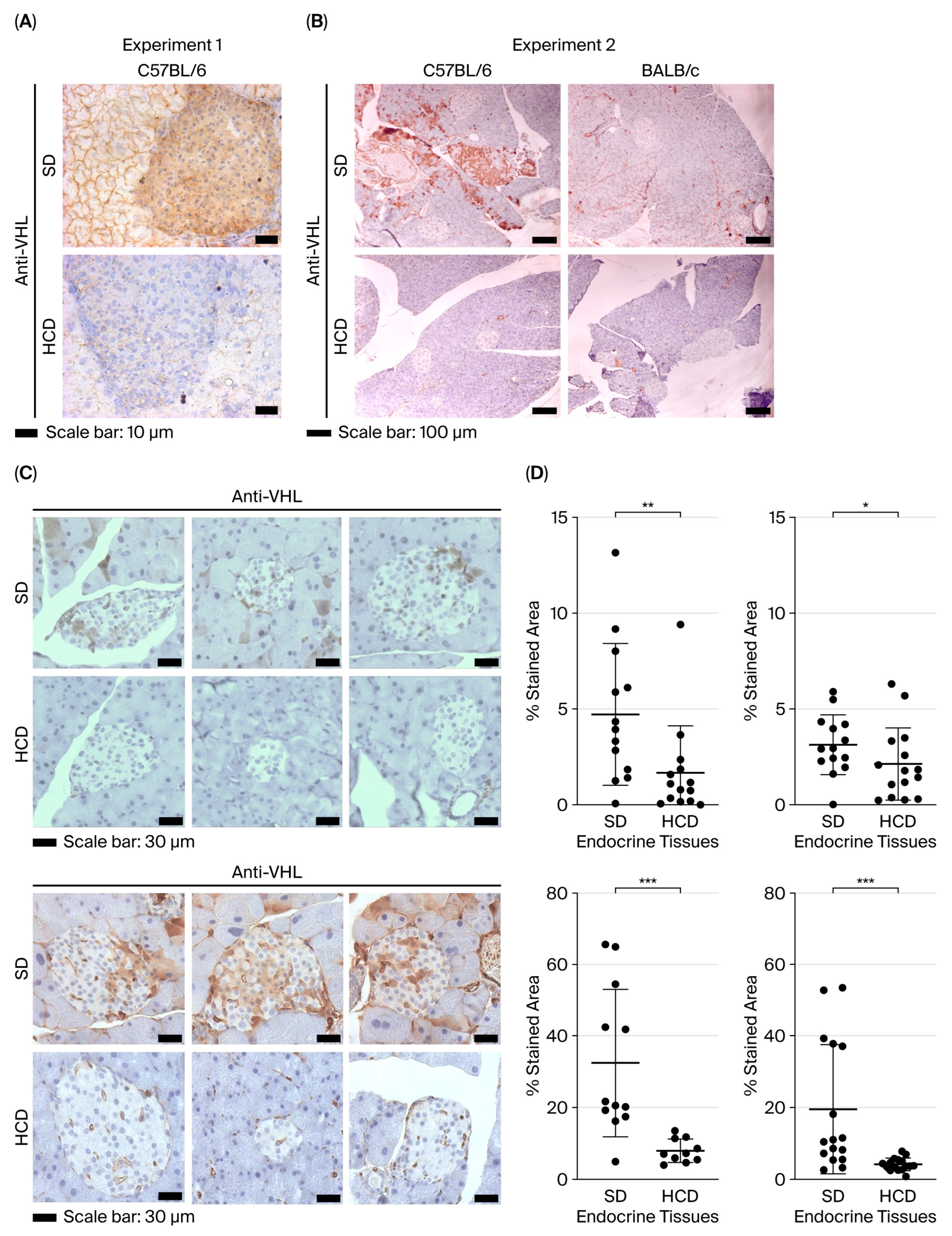 Figure 2. pVHL expression levels in islets of mice fed a high-calorie diet (HCD) and standard diet (SD). Immunohistochemistry with anti-pVHL antibody was performed on the pancreas of mice fed a high-calorie diet (HCD) and a standard diet (SD). Experiment 1 (A) was performed with a single mouse of the C57BL/6 strain fed an HCD and another mouse of the same strain fed an SD. Images were acquired at 40× Magnification. Experiment 2 (B) consisted of C57BL/6 and BALB/c mouse strains obtained from a different breeding batch than experiment 1, with one mouse fed an HCD and another mouse fed an SD. All Images were acquired at 10× Magnification. Experiment 3: A group of 8 mice from the two strains (BALB/c and C57BL/6) were fed HCD, and a group of 8 mice from the two strains were fed SD. The mice in experiment 3 (C,D) were taken from a different breeding batch than the previous experiments. Representative immunohistochemistry results from three mice fed with both diets are shown in (C) (the six images above correspond to BALB/c mice and the six images below correspond to C56BL/6 mice). Images were acquired at 40× Magnification. (D): A semiquantitative analysis of the immunostaining level for pVHL was performed using the FijiImageJ software with a group of 8 mice from experiment. The two graphs above correspond to BALB/c mice, and the two graphs below correspond to C56BL/6 mice. For each strain, the percentage of the stained area in endocrine and exocrine tissues was measured. The asterisk indicates a significant difference according to an unpaired t-test (* = p < 0.05; ** = p < 0.01; *** = p < 0.001).
