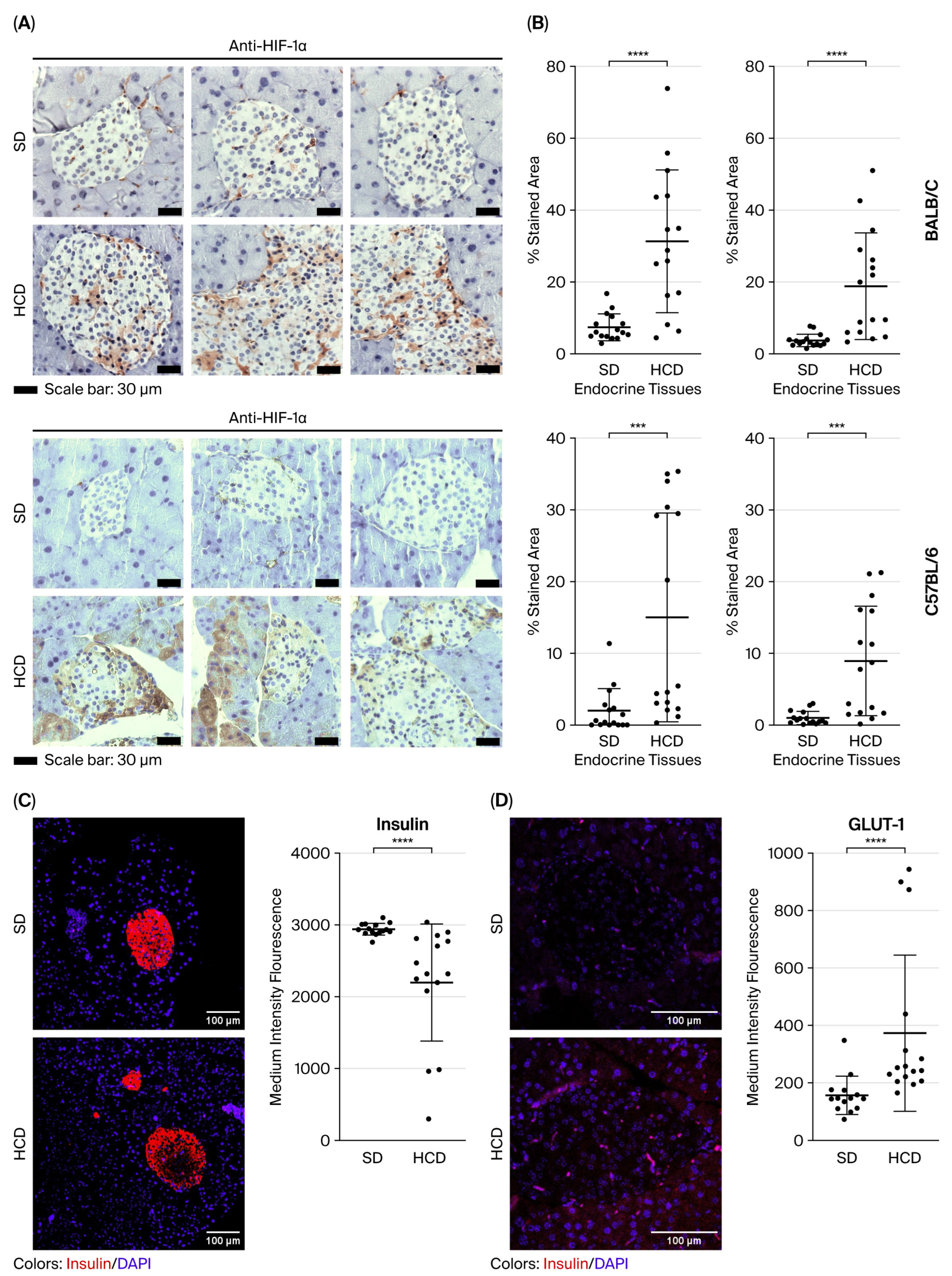 To verify the VHL-HIF-1alpha axis in mice fed HCD, the level of HIF-1α expression was measured and compared with pVHL expression levels. Additionally, GLUT-1 was assessed because it is known to be positively regulated by HIF-1alpha [12]. Insulin was also measured because the KO-VHL beta-cells showed decreased insulin expression [4,5,6]. Figure 3A shows strong immunostaining with the anti-HIF-1α antibody in the pancreatic islets and exocrine tissues of BALB/c mice fed HCD, especially when pVHL immunostaining is low. In contrast, low HIF-1α immunostaining is observed in BALB/c mice fed with a standard diet (SD). For the C57BL/6 strain, a strong HIF-1α immunodetection is also observed in the pancreas of mice fed HCD compared to those fed SD (Figure 3A). Analysis of HIF-1α immunostaining intensity indicates that both endocrine and exocrine tissues show a significant increase in the HCD-fed group for both strains compared to the SD group (Figure 3B). These results suggest that HCD feeding increases HIF-1α activity and correlates with low pVHL expression in a hyperglycemic state. Similarly, in the endocrine and exocrine tissues of C57BL/6 mice fed HCD, HIF-1α expression is more abundant than in BALB/c mice fed HCD.