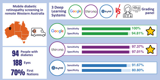 Drinkwater, J.J.; Li, Q.; Woods, K.; Douglas, E.; Chia, M.; Zhou, Y.; Bartnik, S.; Shah, Y.; Shah, V.; Keane, P.A.; et al. A Real-World Comparison of Three Deep Learning Systems for Diabetic Retinopathy in Remote Australia. Diabetology 2025, 6, 146. https://doi.org/10.3390/diabetology6120146