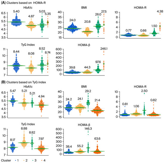 Characteristics of the clusters identified by glycemic cluster analysis. The HbA1c level, BMI, HOMA-R, TyG index, and HOMA-β for each individual within each cluster are plotted on each panel. (A): Clusters were identified on the basis of the HbA1c level, BMI, HOMA-R, and HOMA-β (clusters based on HOMA-R). (B): Clusters were identified on the basis of the HbA1c level, BMI, TyG index, and HOMA-β (clusters based on the TyG index). The grey line on each panel shows the mean value for all samples. The mean value for each plot is shown numerically at its upper end and as a green diamond on the plot (the center represents the mean, while the upper and lower ends represent the 95% confidence interval for the mean).