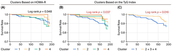 Risk of incident CVD associated with each cluster. The risk of incident CVD associated with each cluster during the 188-month follow-up period was examined using the Kaplan–Meier method. The risk of incident CVD associated with clusters identified by glycemic cluster analysis based on the HbA1c level, BMI, HOMA-β, and either HOMA-R (Panel (A)) or the TyG index (Panels (B,C)) is shown. In Panel (C), clusters 2–4 from Panel (B) were combined and set as the control group. Differences among the clusters were assessed using a log-rank test. Statistical significance was set at p < 0.05 and presented in red.