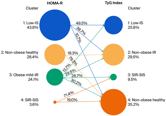 Relationships between clusters defined by cluster analysis using the HbA1c level, BMI, HOMA-β, and HOMA-R (HOMA-R) or the TyG index (TyG index). The extent to which individuals in each cluster obtained by cluster analysis using the HOMA-R were reclassified into clusters obtained by cluster analysis using the TyG index is shown schematically with percentages and arrows. To simplify the figure, reclassifications of less than 10% are omitted.