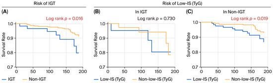 Risk of incident CVD in relation to IGT and the Low-IS (TyG) cluster. The risk of incident CVD in relation to IGT (Panel (A)) and the Low-IS (TyG) cluster (Panels (B,C)) during the 188-month follow-up period was examined using the Kaplan–Meier method. The risk associated with the Low-IS (TyG) cluster was examined by stratification based on the presence or absence of IGT: IGT group (Panel (B)) and non-IGT group (Panel (C)). Differences among groups were assessed using the log-rank test. Statistical significance was indicated by p < 0.05 and is shown in red.
