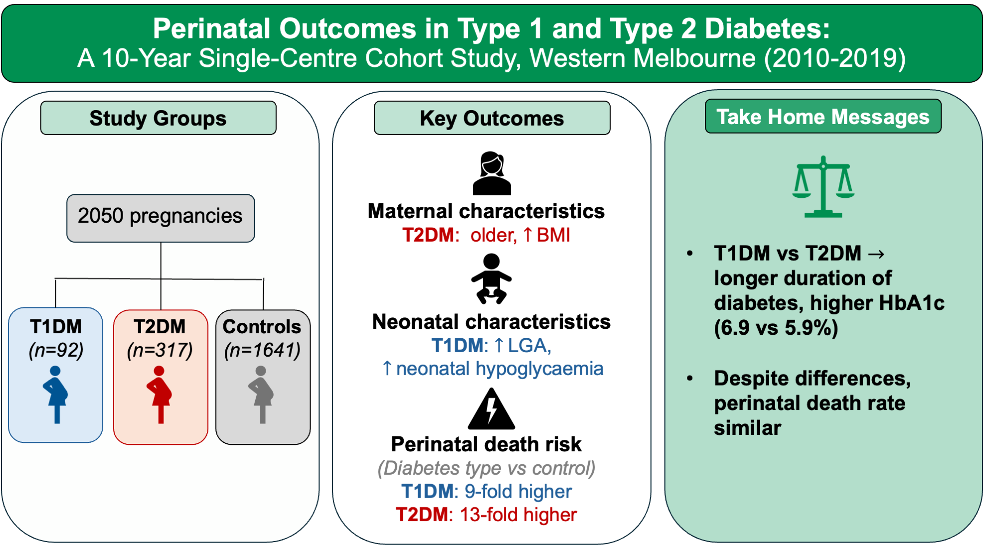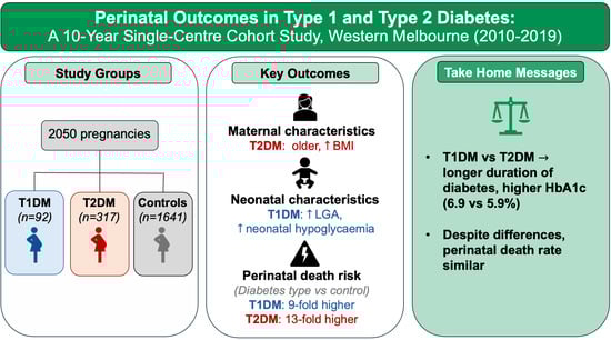 Lawton P, Lu J, Endall R, Luo J, Foskey R, Kevat D, Hamblin PS, Said JM, Teale G, Yates CJ, et al. Perinatal Outcomes of Type 1 and Type 2 Diabetes in Pregnancy: A 10-Year Single-Centre Cohort Study. Diabetology. 2025; 6(12):151. https://doi.org/10.3390/diabetology6120151