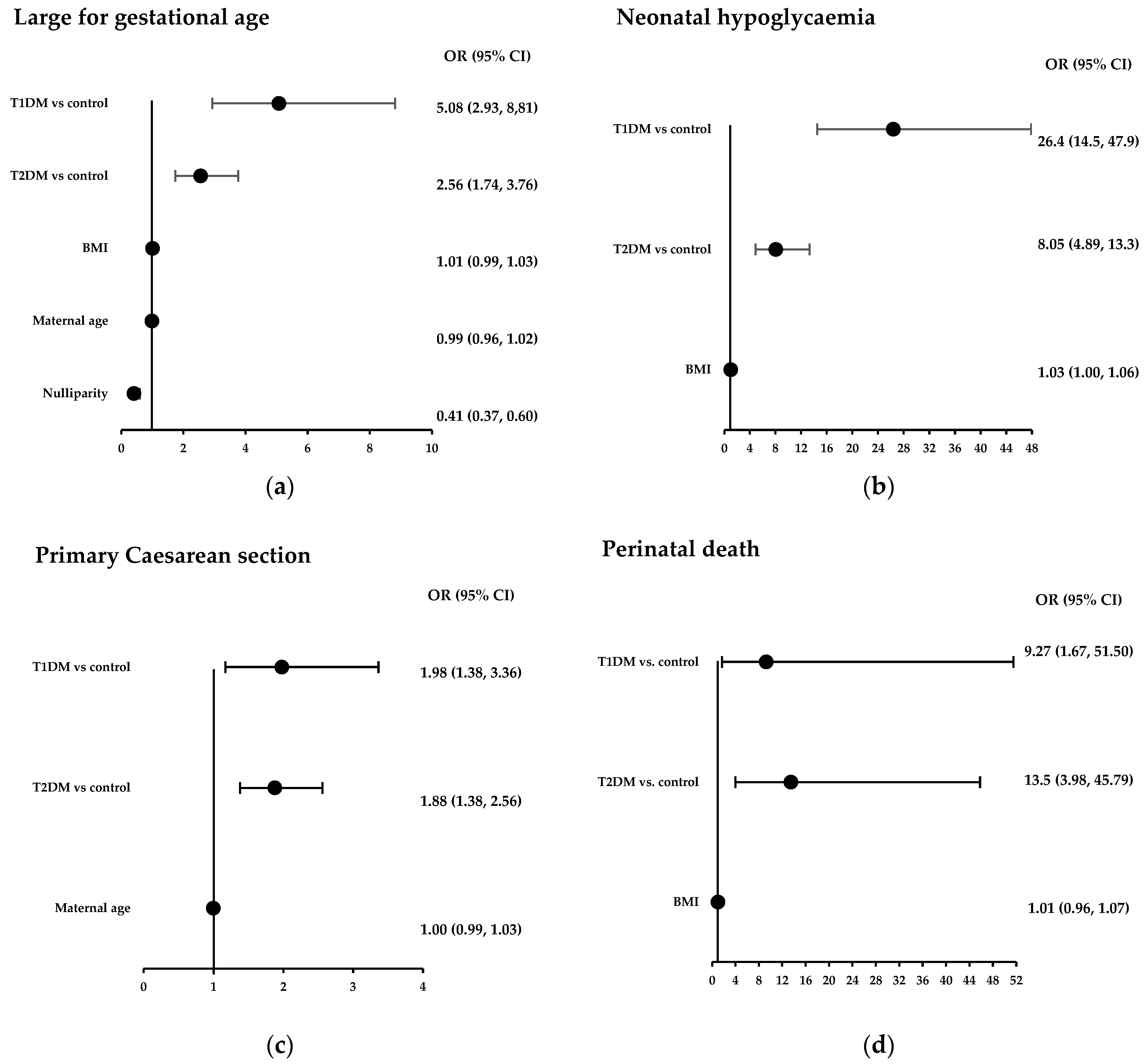 - Balsells, M.; García-Patterson, A.; Gich, I.; Corcoy, R. Maternal and fetal outcome in women with type 2 versus type 1 diabetes mellitus: A systematic review and metaanalysis. J. Clin. Endocrinol. Metab. 2009, 94, 4284–4291. [Google Scholar] [CrossRef] [PubMed]