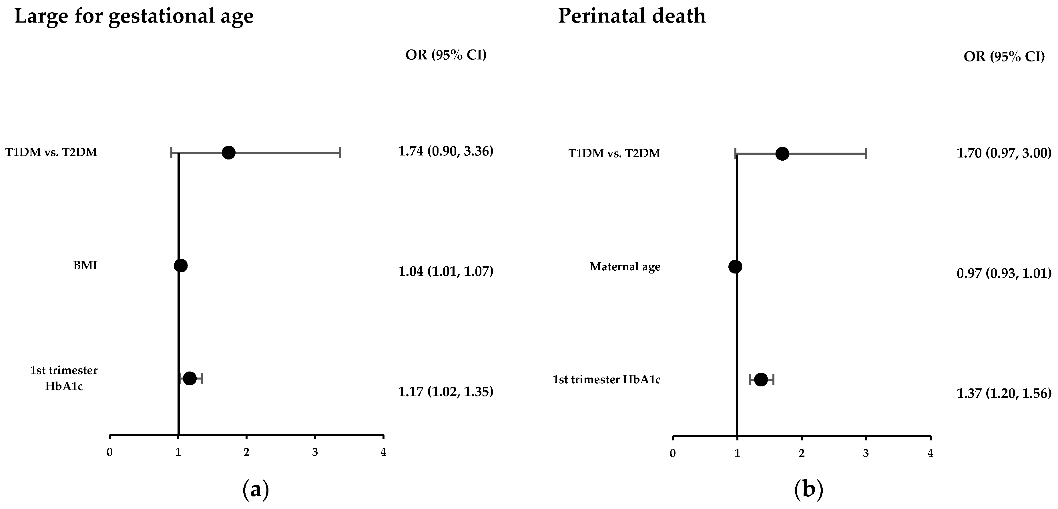 - Seah, J.-m.; Kam, N.M.; Wong, L.; Tanner, C.; Shub, A.; Houlihan, C.; Ekinci, E.I. Risk factors for pregnancy outcomes in Type 1 and Type 2 diabetes. Intern. Med. J. 2021, 51, 78–86. [Google Scholar] [CrossRef]