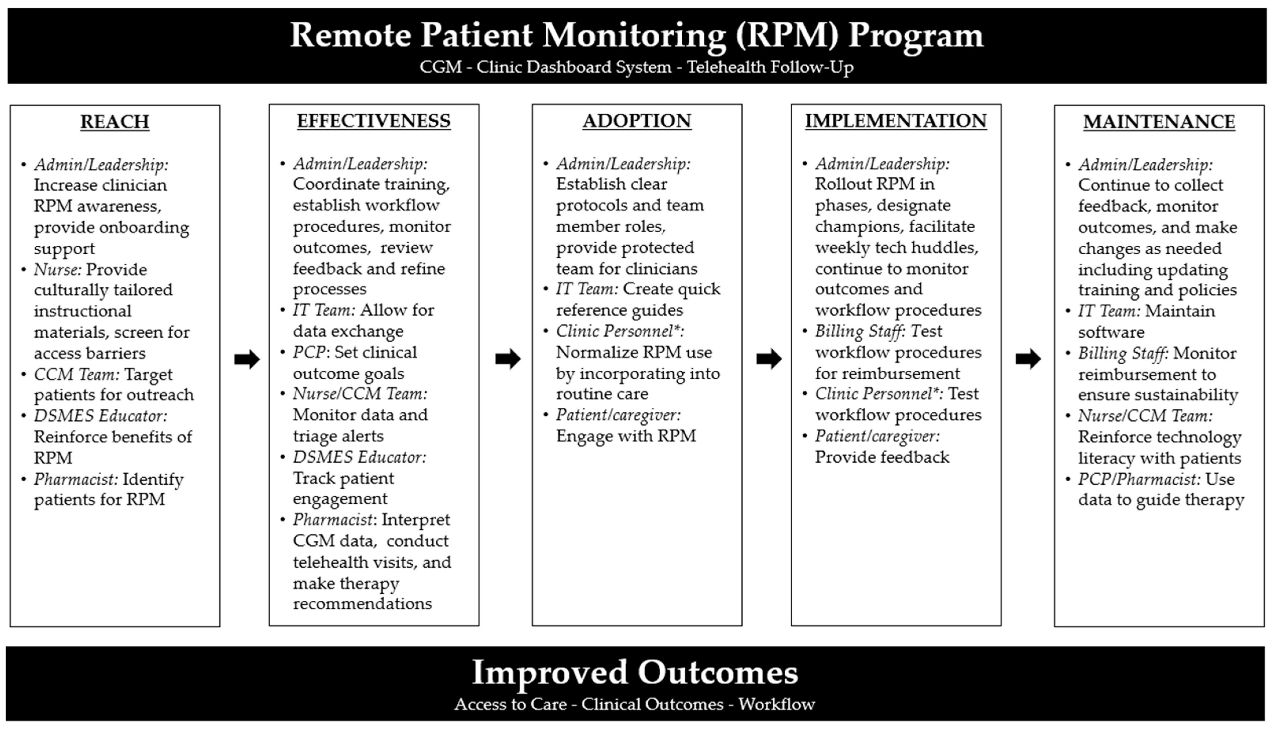 To ensure RPM is offered to appropriate patients, the clinic can use patient portal announcements and targeted telephone outreach from the Chronic Care Management (CCM) team. Administration can develop culturally tailored and multi-lingual instructional materials that nurses can provide during diabetes management visits, along with screening for access barriers. DSMES educators can reinforce the value of the RPM program in their sessions and offer direct enrollment. Pharmacists can identify eligible patients based on medication use or glycemic control patterns. Offering step-by-step onboarding support, including device and app set-up, to patients and caregivers will also promote early engagement. In addition, leadership can build awareness among clinicians through demonstration sessions and presentation of evidence demonstrating clinical and workflow benefits.
