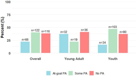 Regarding diabetes technology, 56% used both CGM and an insulin pump, whereas only ten youth and young adults (3%) used an insulin pump without CGM. Overall, 78% of the youth and young adults did not meet PA goals, and nearly half of those reported doing no moderate-to-vigorous PA (Figure 1 and Figure 2). Notably, young adults were more likely than youth to meet the PA goal (37% vs. 16%) (Table 1).