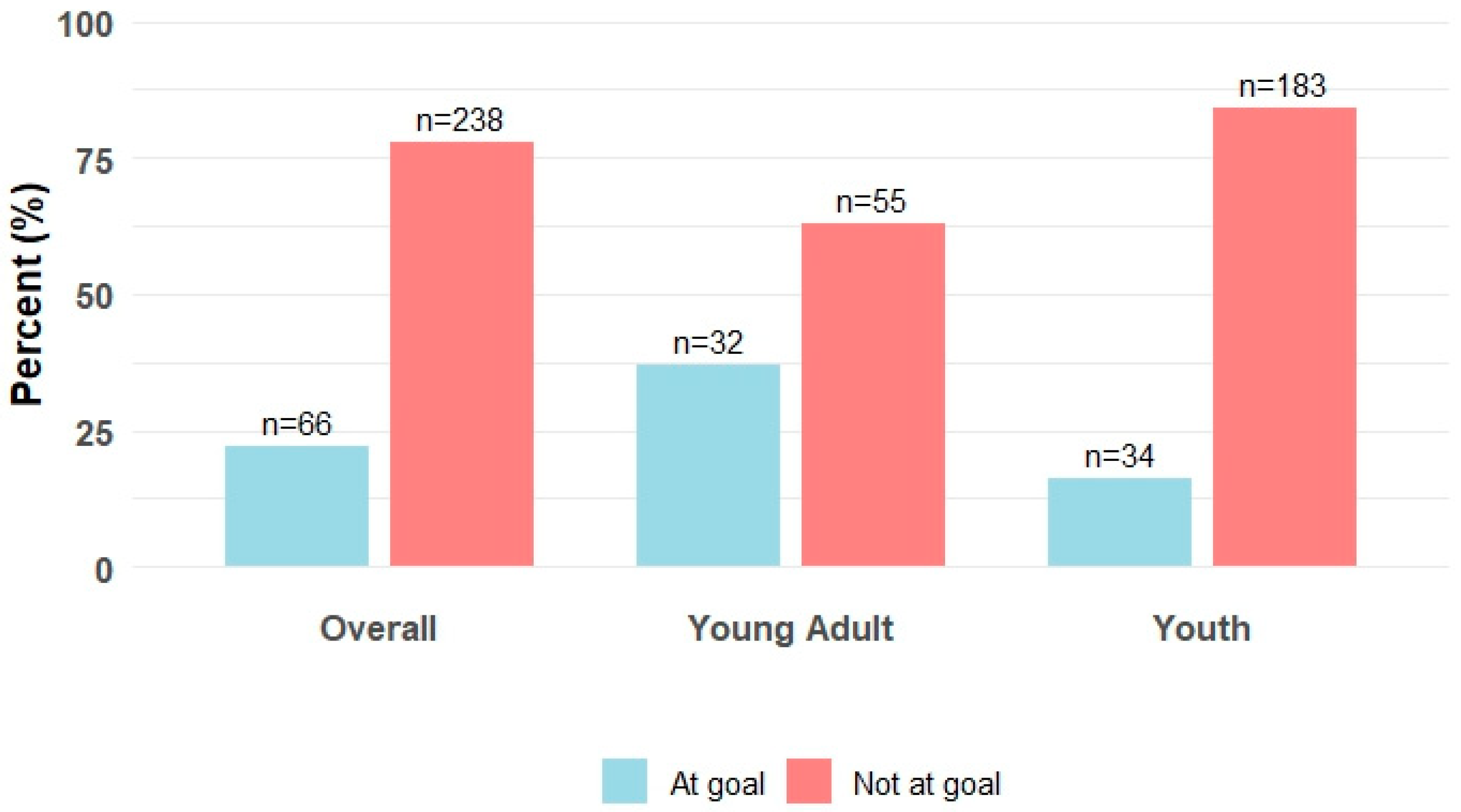 Continuous variables were presented as means (SD) and categorical variables as counts (%). Group differences between the two PA attainments (‘not at goal’ vs. ‘at goal’) were assessed with independent-samples t-tests (or Welch’s t-test when homogeneity of variance assumption was violated) for continuous outcomes (BMI, HbA1c, HDL, LDL, systolic BP, and diastolic BP) and with Pearson’s Chi-square (χ2) or Fisher’s exact tests for categorical variables (demographics and diabetes technology use). BMI was reported and analyzed only among the young adult group aged 18–25 years because BMI evaluation for youth < 18 years requires age- and sex-specific percentile values, which were not available in this study.