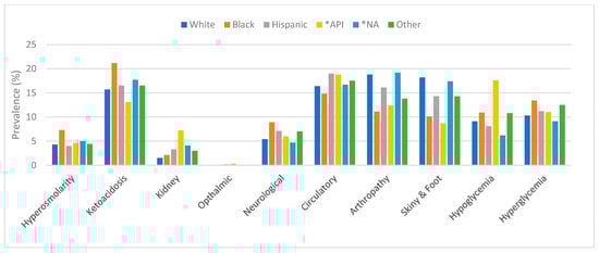 Approximately 38 million people in the United States have diabetes, most commonly type 2 (95%), with 7.6 million people having undiagnosed diabetes [1]. As of 2022, diabetes was the eighth leading cause of death in the United States [1]. The prevalence of type 2 diabetes is highest in adults over 65 and disproportionately affects minorities [2,3]. Members of Black and Hispanic race/ethnic groups also face a disproportionate prevalence of diabetic health complications and increased odds of diabetes-related mortality compared to Whites [3,4,5,6]. Data from the National Inpatient Sample (NIS) of the Healthcare Cost and Utilization Project (HCUP) includes several important complications for diagnostic coding and billing including kidney, ophthalmic, neurological, oral, and circulatory complications as well as hyperosmolarity, ketoacidosis, arthropathy, skin and foot issues, and hypo- and hyperglycemia [7]. This study focuses on these specific type 2 diabetes complications, particularly highlighting the disproportionate burden experienced by different racial/ethnic groups.