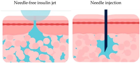 Schematic drawing of insulin delivery directly through the skin without a needle (left), and traditional needle injection (right). Note that in the first case, insulin is distributed uniformly in the subcutaneous tissue, while in the second it remains concentrated in a single point.