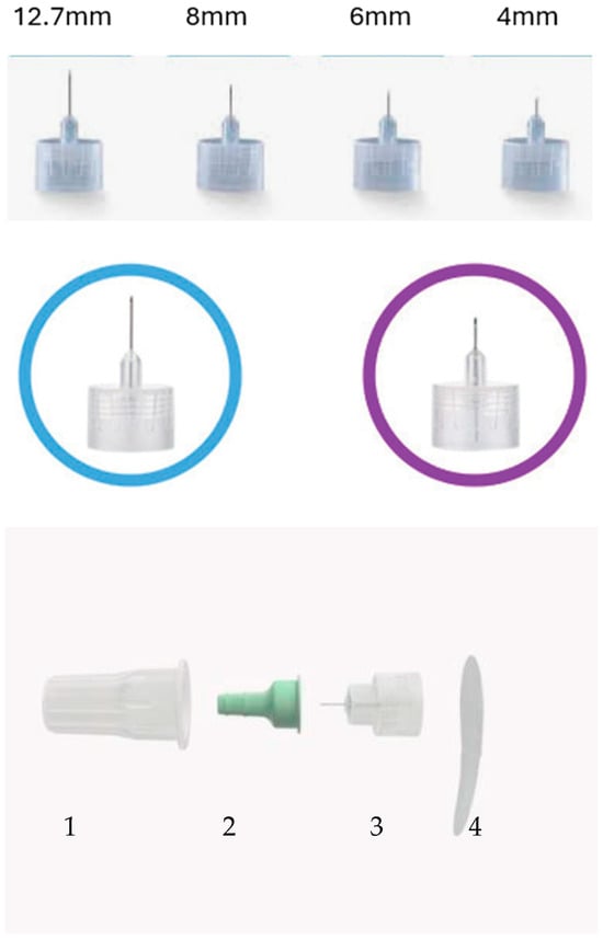 Insulin pen needles of different lengths (top). In the middle panel, detail on the comparison of an 8 mm (left) and 4 mm (right) needle. In the lower panel from left to right you can see (1) the external needle container, (2) the needle tip protection, (3) the needle, and (4) the hermetic and waterproof closure of the container.