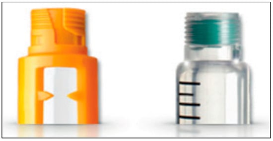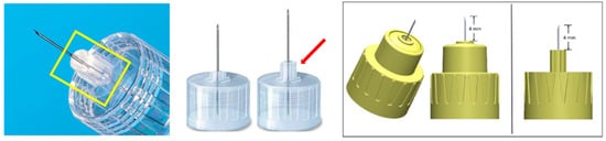 However, despite being generally considered low-tech devices, pen needles have different features from one another as follows: (i) to guarantee stability and conservation, the external casing must be composed of waterproof synthetic material; (ii) to be easily seen by users and removed before the injection, the internal protective casing must be colored and non-transparent; (iii) to prevent the skin from being traumatized at the time of injection (as sometimes happens if the user exerts vigorous pressure), the implant base must be wide [36,37,38,39] (Figure 4, Figure 5, Figure 6 and Figure 7).