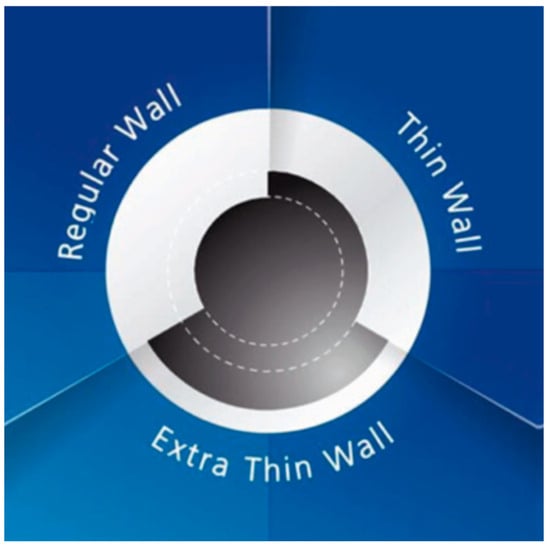 Schematic representation of the wall thickness of the traditional (regular wall), thin (thin wall) and ultra-thin (extra-thin wall) needle, respectively of a progressively larger internal caliber (source: personal archive).