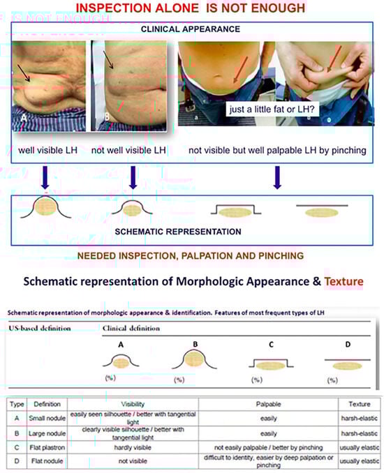 In clinical practice, LH is usually diagnosed by physical examination, that is, visually and by palpation [55,56]. The most common presentation of LH is large, visible, and aesthetically displeasing mounds. However, increasing evidence suggests LH exists in various forms, many of which are not easily seen or palpation-detectable [54] (Figure 12).