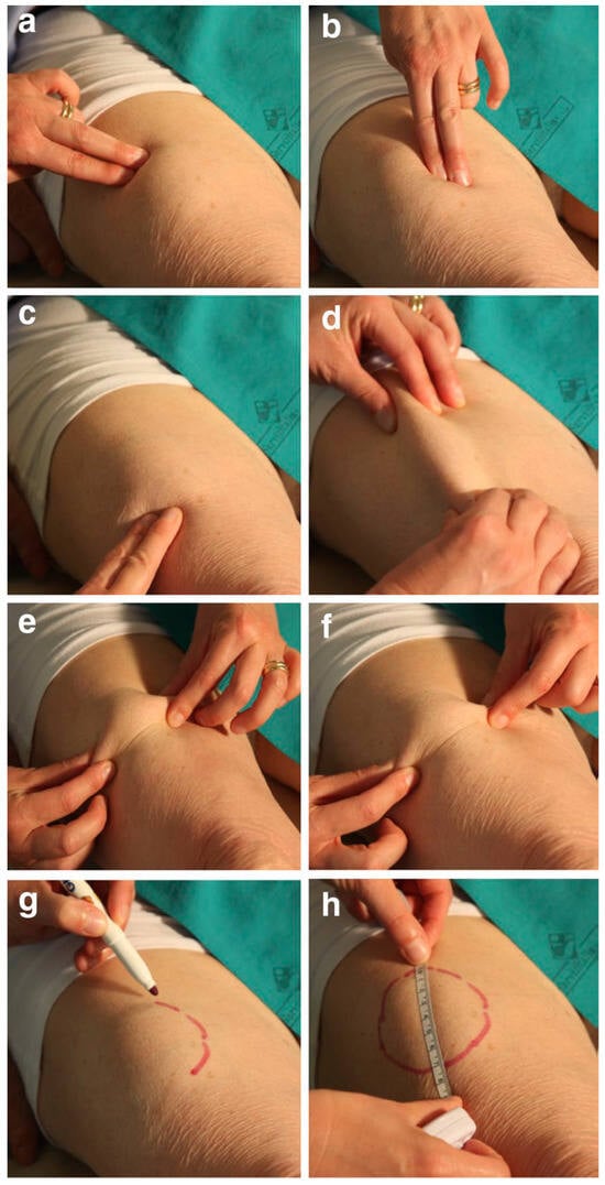 Lipohyertrophy identification technique. The figure shows how to identify an LH lesion after a thorough inspection of the area by performing repeated vertical and horizontal fingertip movements and around it (a–c), pinching it (d–f), and marking it (g) and how to finally measure it (h). (source: personal archive).