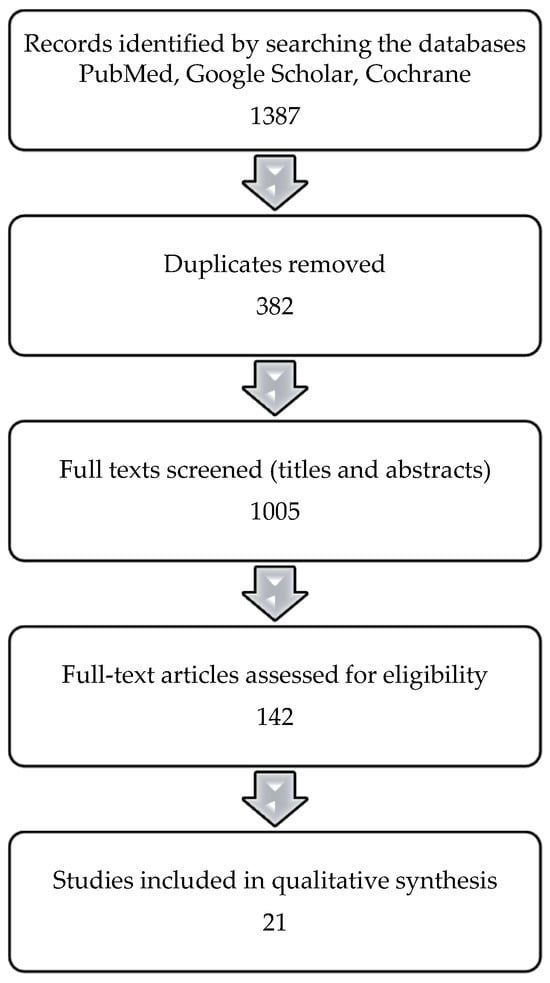 A total of 1387 records were identified from the database searches. After removing 382 duplicates, 1005 titles and abstracts were screened. Of these, 142 full-text articles were assessed for eligibility. Based on the inclusion and exclusion criteria, 21 studies were included in the final synthesis (Figure 1).