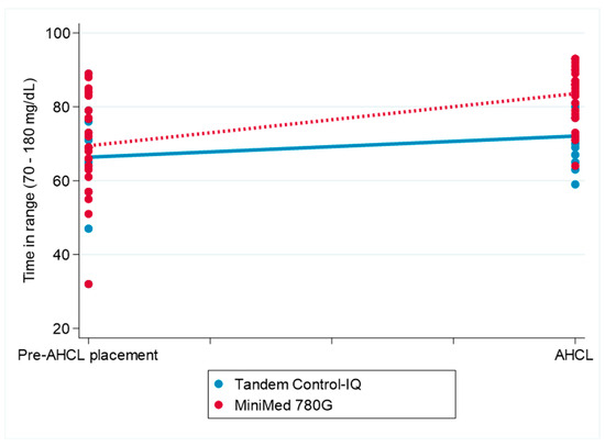 Second, a linear mixed-effects regression model was applied using the conventional time in range (70–180 mg/dL) metric as the dependent variable. Fixed effects included the type of AHCL system, the interaction between timepoint and AHCL system type, and sex (to account for the imbalance between treatment groups), while a random intercept was specified for each subject ID.