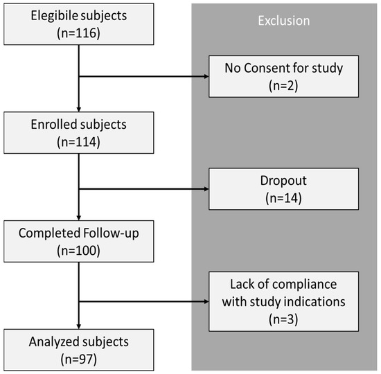 A total of 116 patients were enrolled, of which 97 achieved sufficient compliance for the quantitative and aggregated analysis of the data (Figure 1): Two participants did not provide consent, fourteen dropped out (eight due to mild gastrointestinal side effects such as nausea, vomiting, and diarrhea, and six due to other minor side effects including headache, fatigue, and appetite changes), and three were excluded for non-compliance with study procedures. At recruitment, the median age of the sample was 64 years [interquartile range (IQR): 57–69]. The median duration since diabetes diagnosis was 5 years (IQR: 3–9). The mean weight was 94.5 ± 15.5 kg, and the average height was 1.77 ± 0.09 m. The median BMI was 34.30 kg/m2 (IQR: 29.35–38.18). For glycemic parameters, the median FPB was 146 mg/dL (IQR: 122–173), and the median HbA1c% was 7.69% (IQR: 7–8.46). Regarding lipid profile, the mean HDL-C levels were 45.07 ± 10.47 mg/dL, the mean LDL-C levels were 100.32 ± 34.52 mg/dL, and the median TGs were 148 mg/dL (IQR: 122–190). Detailed baseline characteristics are summarized in Table 1.