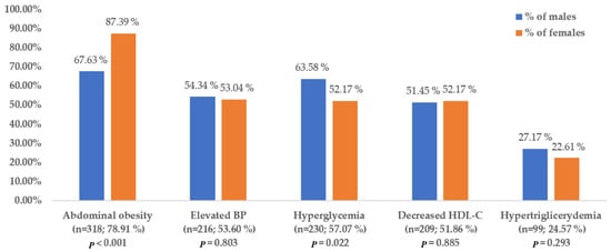 In our cohort, the predominant element of metabolic syndrome was abdominal obesity (n = 318; 78.91%), followed by hyperglycemia (n = 230; 57.07%), elevated blood pressure (n = 216; 53.60%), and reduced HDL-C concentration (n = 209; 51.86%), with hypertriglyceridemia being the least prevalent component (n = 99; 24.57%). A statistically significant difference in the prevalence of specific components of metabolic syndrome based on gender was observed only in abdominal obesity (which was more prevalent in females—87.39% vs. 67.63%; p < 0.001) and hyperglycemia (more prevalent in men—63.58% vs. 52.17%; p = 0.022)—Figure 1 illustrates the full gender differentiation of metabolic syndrome components in our group.