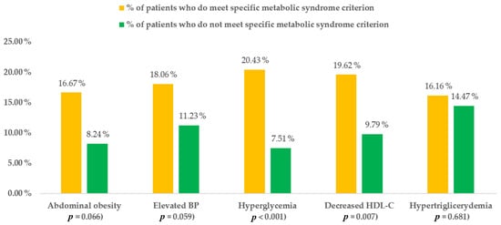 Hypomagnesemia was markedly more prevalent in individuals with confirmed metabolic syndrome compared to those who did not fulfill the diagnostic criteria (20.18% vs. 8.33%; p = 0.002), with the relative risk for this cohort being 2.42 (95%CI: 1.40–3.40). Data on patients who met and did not meet the individual criteria for the diagnosis of metabolic syndrome were analyzed: the components most frequently associated with hypomagnesemia, in order, were hyperglycemia (20.43%), decreased HDL-C (19.62%), elevated blood pressure (18.06%), abdominal obesity (16.67%), and hypertriglyceridemia (16.16%). Statistically significant differences were identified only for hyperglycemia and decreased HDL-C, in contrast to raised blood pressure and abdominal obesity (p-values ranging from 0.059 to 0.066). Detailed data about differences are presented in Figure 2.