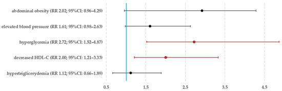 The relative risk of hypomagnesemia assessed for each individual component of the metabolic syndrome (data that fulfill the criterion of statistical significance are highlighted in red).