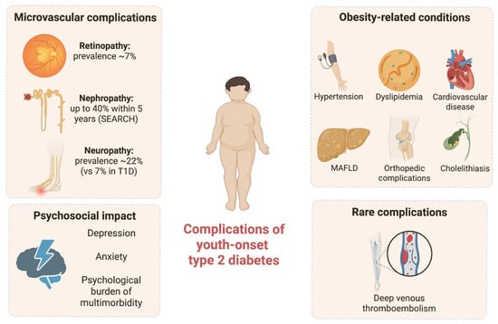 Diabetic retinopathy is a serious microvascular complication of T2D, and although traditionally considered a late-onset complication, it has increasingly been reported in children and adolescents with T2D. A recent systematic review and meta-analysis of 27 observational studies including children and adolescents with T2D showed that diabetic retinopathy was present among 6.99% of participants, with prevalence increasing significantly with longer diabetes duration [69].