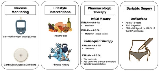 Given the known association of youth-onset T2D with both microvascular and macrovascular complications within the first years of disease, maintaining optimal glycemic control in this population is crucial [73]. Management of T2D needs a comprehensive approach that involves education, lifestyle modifications, regular physical activity, and, when indicated, intensive glucose monitoring and pharmacologic treatment [7] (Figure 2). However, in pediatric populations, achieving therapeutic goals can be challenging due to the limited availability of approved treatment options and the complexities associated with growth and development [73].