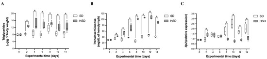 Figure 1. Effect of high-sugar diet (HSD) on total triglyceride concentration (A), hemolymph trehalose + glucose concentration (B), and head Ilp2 relative expression (C) in male Drosophila melanogaster over 14 days. Data are shown as medians with interquartile ranges. * indicates statistically significant differences (p < 0.05) between groups (SD vs. HSD), as assessed by Dunnett’s or Wilcoxon signed-rank test. SD: standard diet; HSD: high-sugar diet.