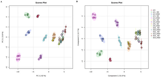 Figure 2. Multivariate analyses of targeted longitudinal lipidome profile of SD- and HSD-fed male Drosophila melanogaster over 14 days. Principal Component Analysis (A) and Partial Least Squares-Discriminant Analysis (B) models of whole targeted lipidome profile of standard diet and high-sugar diet-fed male Drosophila melanogaster at 0, 2, 4, 6, 8, 10, 12 and 14 days. SD: standard diet; HSD: high-sugar diet; PC: principal component.