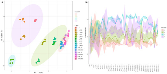 All data are reported as mean values ± standard deviation (s.d.). Outlier (>1.5 IQR) and extreme outlier (>3.0 IQR) values were identified using box-and-whisker plots. Only extreme values were excluded from the analysis to avoid distortion of central tendency measurements, which did not alter the significance or trend of the observed effects. The Kolmogorov–Smirnov test was applied to assess normality, and Levene’s test was used to evaluate variance homogeneity. Then, data were subjected to Dunnett’s test (parametric variables) or Wilcoxon signed-rank test (non-parametric variables). p < 0.05 differences were considered significant. All statistical analyses were performed using JMP software version 15.1 (JMP Statistical Discovery LLC, Greensboro, NC, USA). Principal Component Analysis (PCA) and Partial Least Square-Discriminant Analysis (PLS-DA) plots, as well as hierarchical clustering heatmaps (Euclidean distance), were constructed with lipidomic data at each sampling time (2, 4, 6, 8, 10, 12, and 14 days) and Variable Importance in the Projection (VIP) plots were obtained using the Metaboanalyst 5.0 online platform.