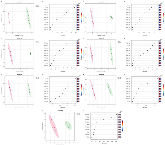Figure 4. Partial Least Square-Discriminant Analysis models and Variable Importance in the Projection plots of the targeted lipidome profile of SD- and HSD-fed male Drosophila melanogaster at 2 (A,B), 4 (C,D), 6 (E,F), 8 (G,H), 10 (I,J), 12 (K,L), and 14 (M,N) days. SD: standard diet; HSD: high-sugar diet; FA: fatty acid; PC: phosphatidylcholine; PE: phosphatidylethanolamine; PI: phosphatidylinositol; PG: phosphatidylglycerol; PS: phosphatidylserine.