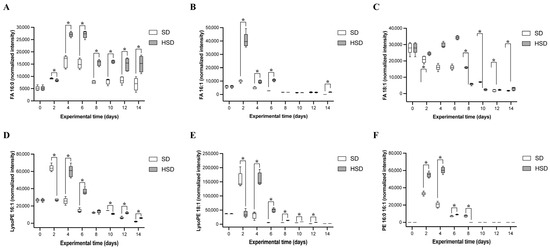 Figure 5. Changes in discriminant lipid species in male Drosophila melanogaster fed SD or HSD over 14 days. FA 16:0 (A), FA 16:1 (B), FA 18:1 (C), LysoPE 16:1 (D), LysoPE 18:1 (E), and PE 16:0 16:1 (F) levels were determined every 2 days during the 14 days of HSD or SD. Data are shown as medians with interquartile ranges. * indicate statistically significant differences (p < 0.05) between experimental groups (SD vs. HSD), as assessed by Dunnett’s or Wilcoxon signed-rank test. SD: standard diet; HSD: high-sugar diet; FA: fatty acid; PE: phosphatidylethanolamine.