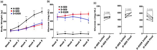 Regarding body weight (Figure 1a), all groups exhibited the same baseline body weight at the start (0 weeks). Subsequently, the H-SED group experienced a markedly greater weight gain (p < 0.001) than the diabetic groups (D-SED and D-EXER) at all measured time points, including by the end of the 8-week intervention. However, no significant differences in weight change were observed between the D-SED and D-EXER groups.
