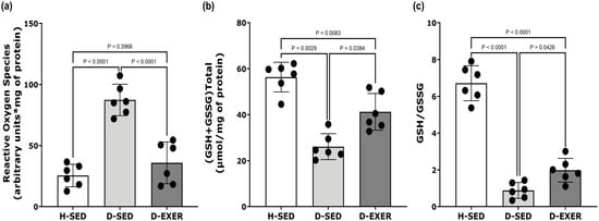 Effect of exercise training on (a) levels of ROS, (b) total glutathione content, and (c) reduced glutathione (GSH)/glutathione disulfide (GSSG) ratio in the soleus muscles of STZ-induced diabetic rats. The black dots represent individual animal variability. Each dataset is expressed as mean ± SD, with n = 6 per group. The data were analyzed using one-way ANOVA and Tukey’s post hoc tests. Statistical significance was defined as p < 0.004 after Bonferroni correction for multiple comparisons. Differences with p-values between 0.004 and 0.05 are considered suggestive. Healthy Sedentary (H-SED); Diabetic Sedentary (D-SED); Diabetic Exercise-Trained (D-EXER).