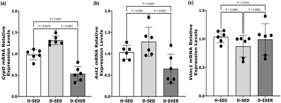 As shown in Figure 3, the mRNA expression levels of CypD in skeletal muscle were significantly elevated in the D-SED group by 34.48% (p < 0.004) compared to the H-SED group. In contrast, exercise training in the D-EXER group resulted in a robust, statistically significant reduction in CypD expression compared with both the H-SED and D-SED groups, with decreases of 43.99% and 58.34%, respectively (p < 0.004).