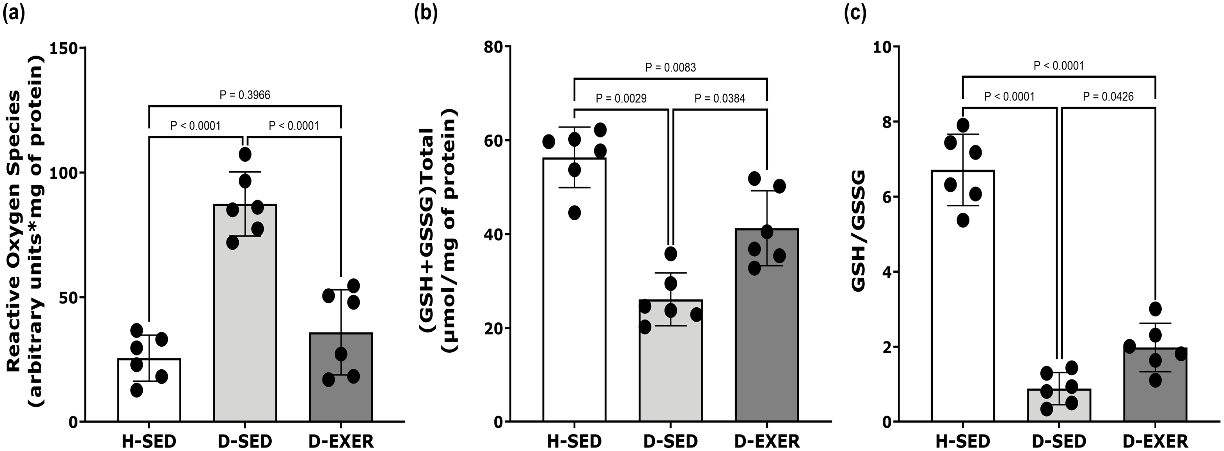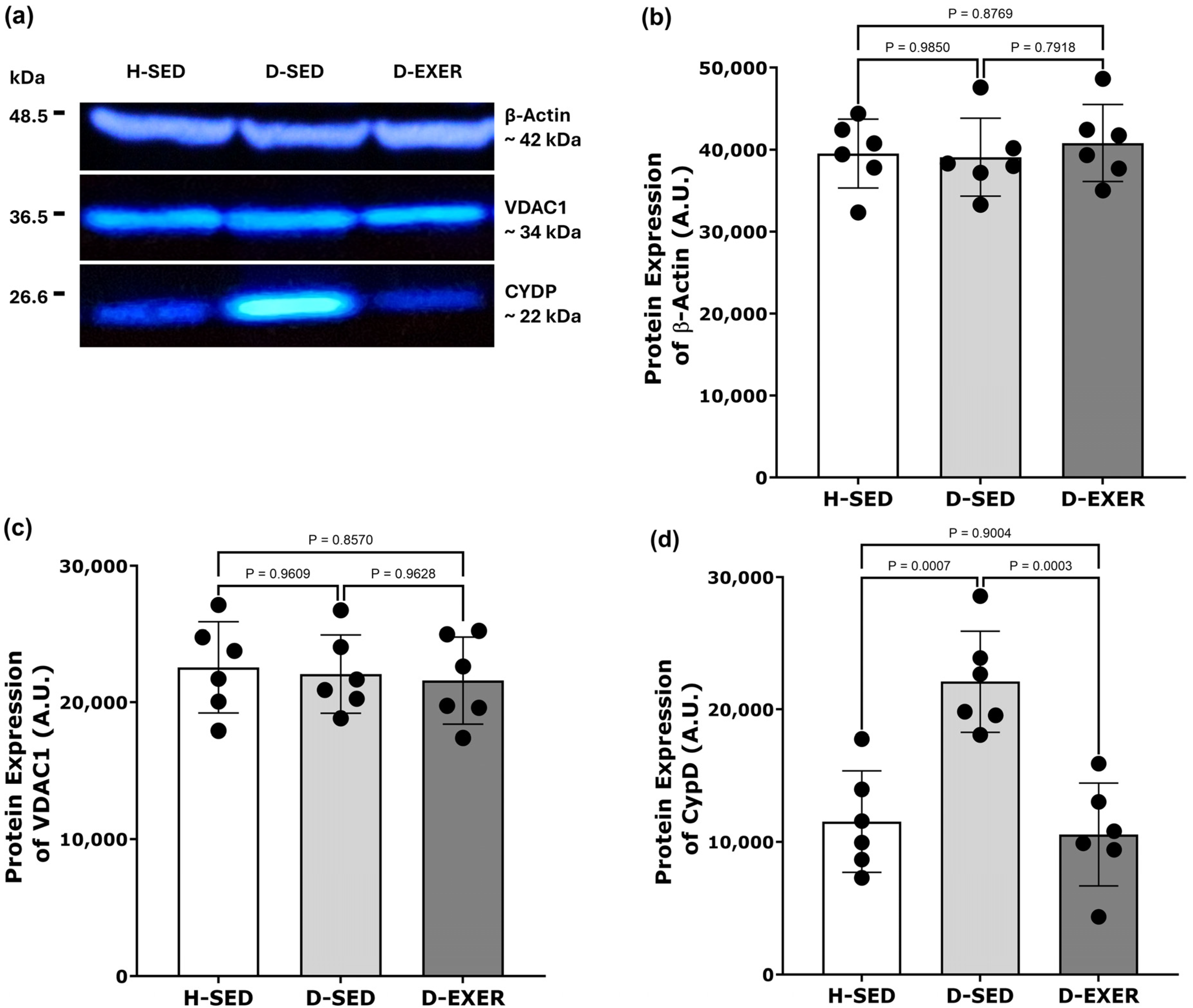 | CypD | H-SED D-SED D-EXER | 0.0857 −0.3714 −0.8714 * | 0.9194 0.4972 0.0428 |