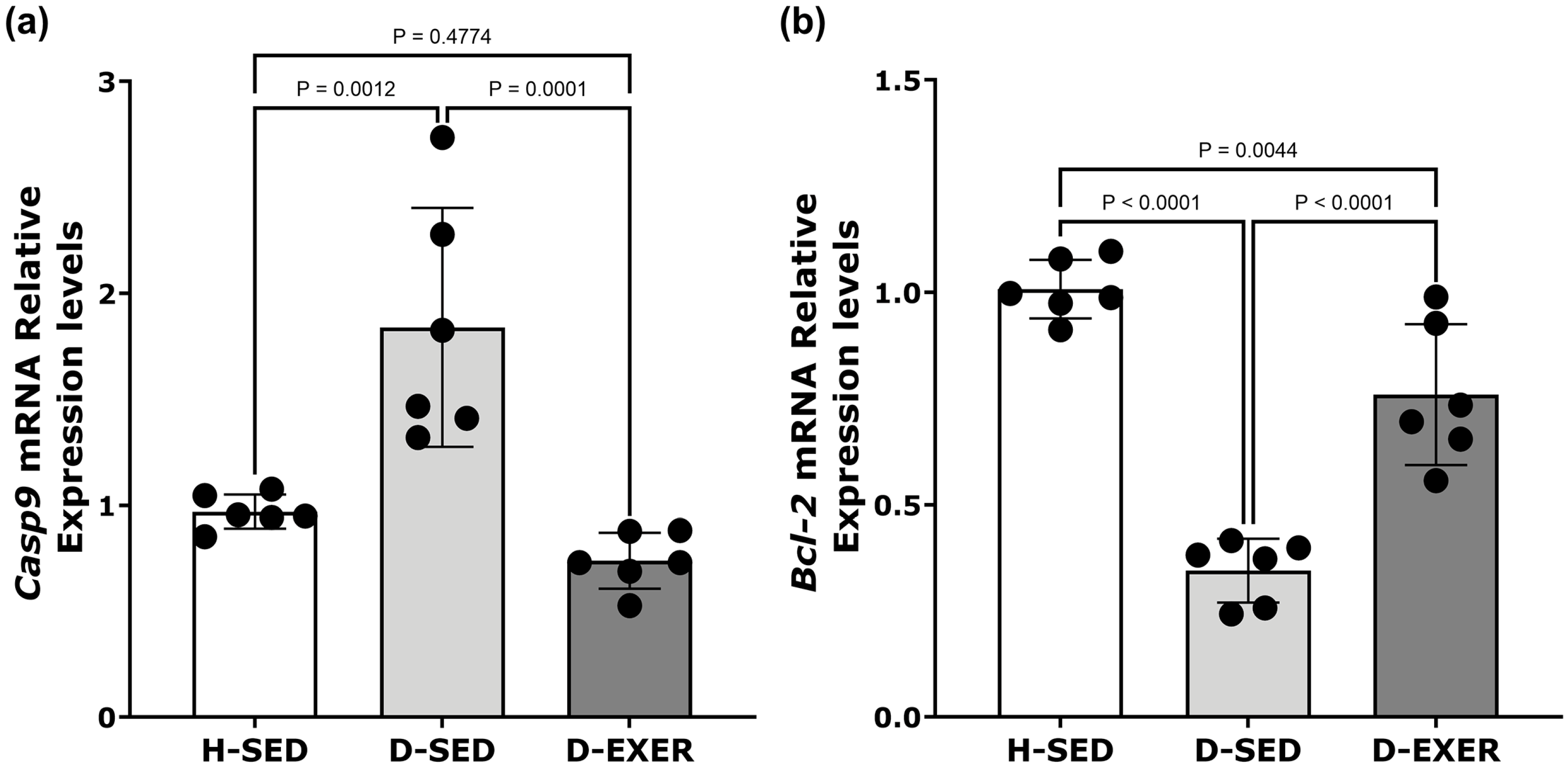 | Casp9 | H-SED D-SED D-EXER | −0.8857 * −0.5429 −0.9429 * | 0.0333 0.2972 0.0167 |