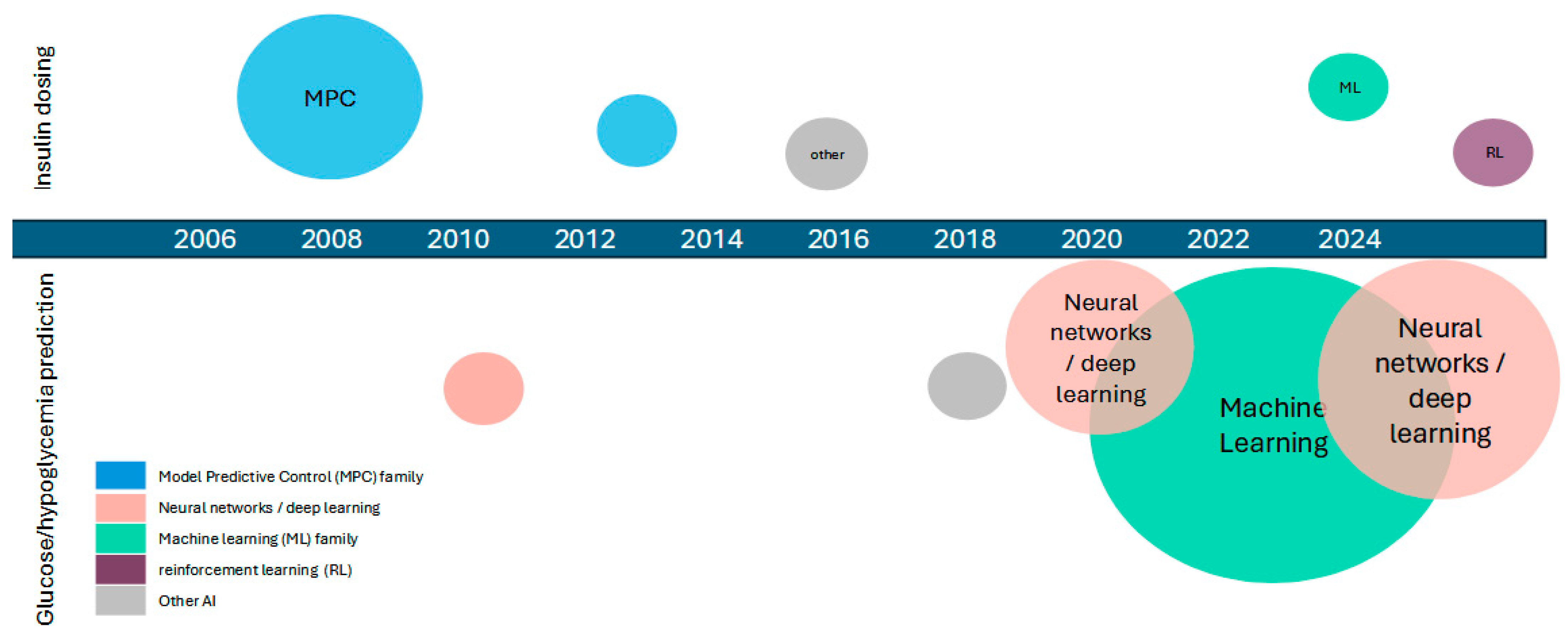 | Model Predictive Control (MPC/eMPC) | Uses a mathematical model of glucose–insulin physiology and element of intelligence by forecasting future glucose trends and optimizing insulin delivery in real time. | IV insulin dosing (ICU) | Stable, safe glucose control in prospective trials; reduces manual calculations; smooth dosing adjustments | Requires frequent glucose input; does not “learn” from new data (not true AI); still limited by intermittent POC testing | Plank, 2006 [31]; Pachler, 2008 [32]; Amrein, 2010 [33]; Kopecký, 2013 [34] |