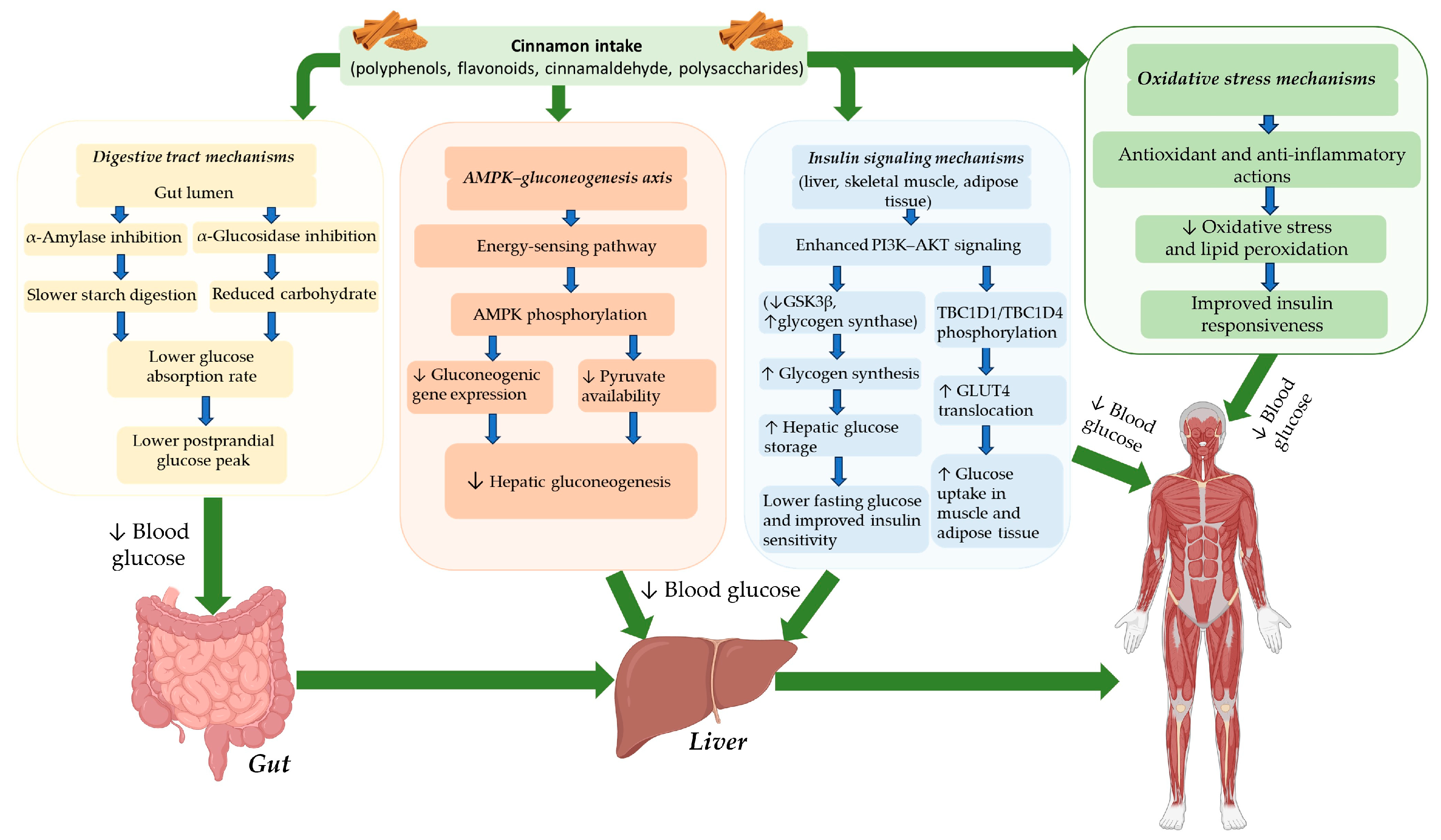- Moridpour, A.H.; Kavyani, Z.; Khosravi, S.; Farmani, E.; Daneshvar, M.; Musazadeh, V.; Faghfouri, A.H. The Effect of Cinnamon Supplementation on Glycemic Control in Patients with Type 2 Diabetes Mellitus: An Updated Systematic Review and Dose-Response Meta-Analysis of Randomized Controlled Trials. Phytother. Res. 2024, 38, 117–130. [Google Scholar] [CrossRef] [PubMed]