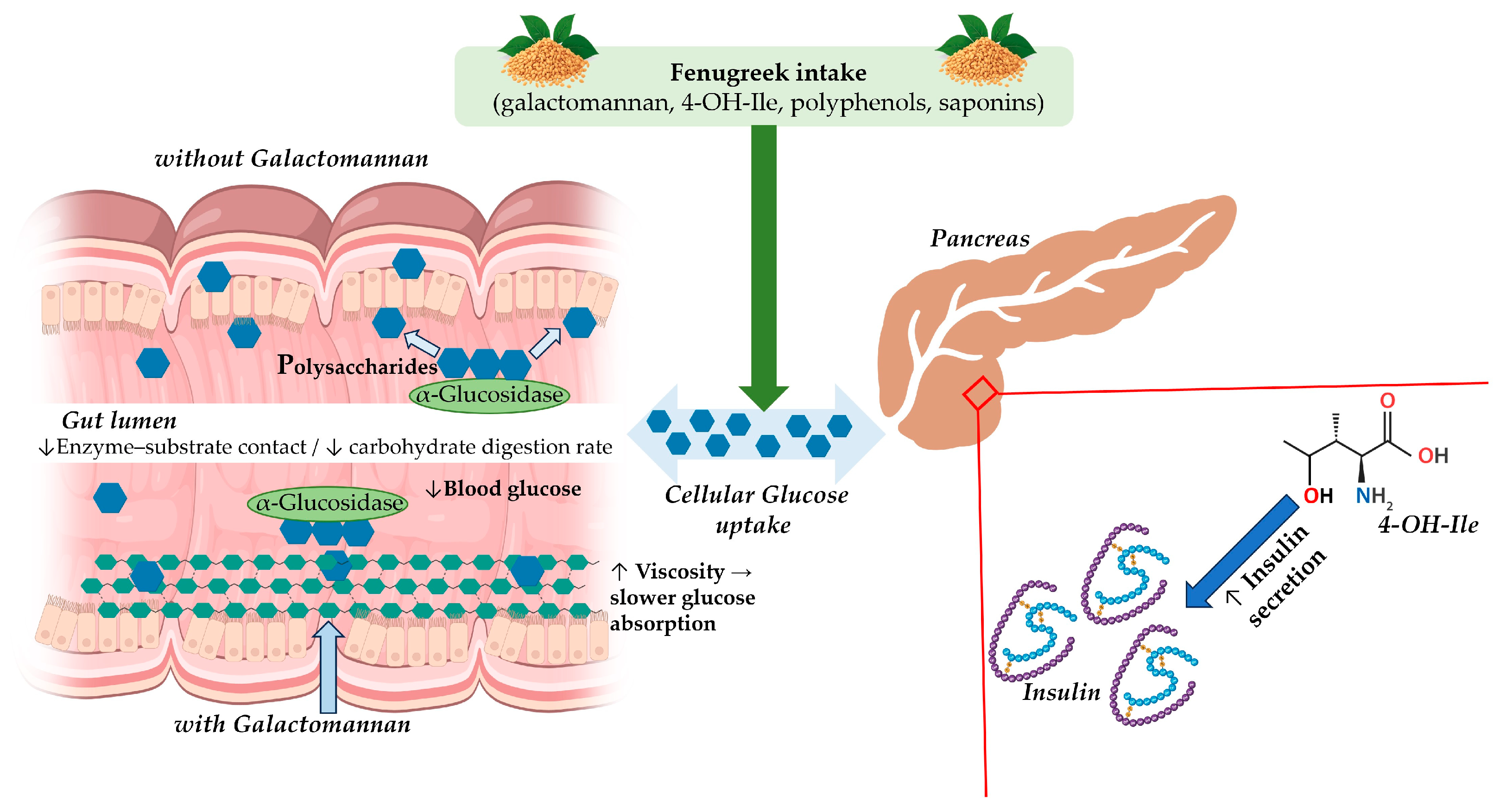 | Trigonella foenum-graecum | ✔✔ viscous fiber | ✔ 4-hydroxyisoleucine | ✔✔ improved sensitivity | ◐ indirect | ✔ delayed absorption | ✔ | ✔✔ fiber-driven |