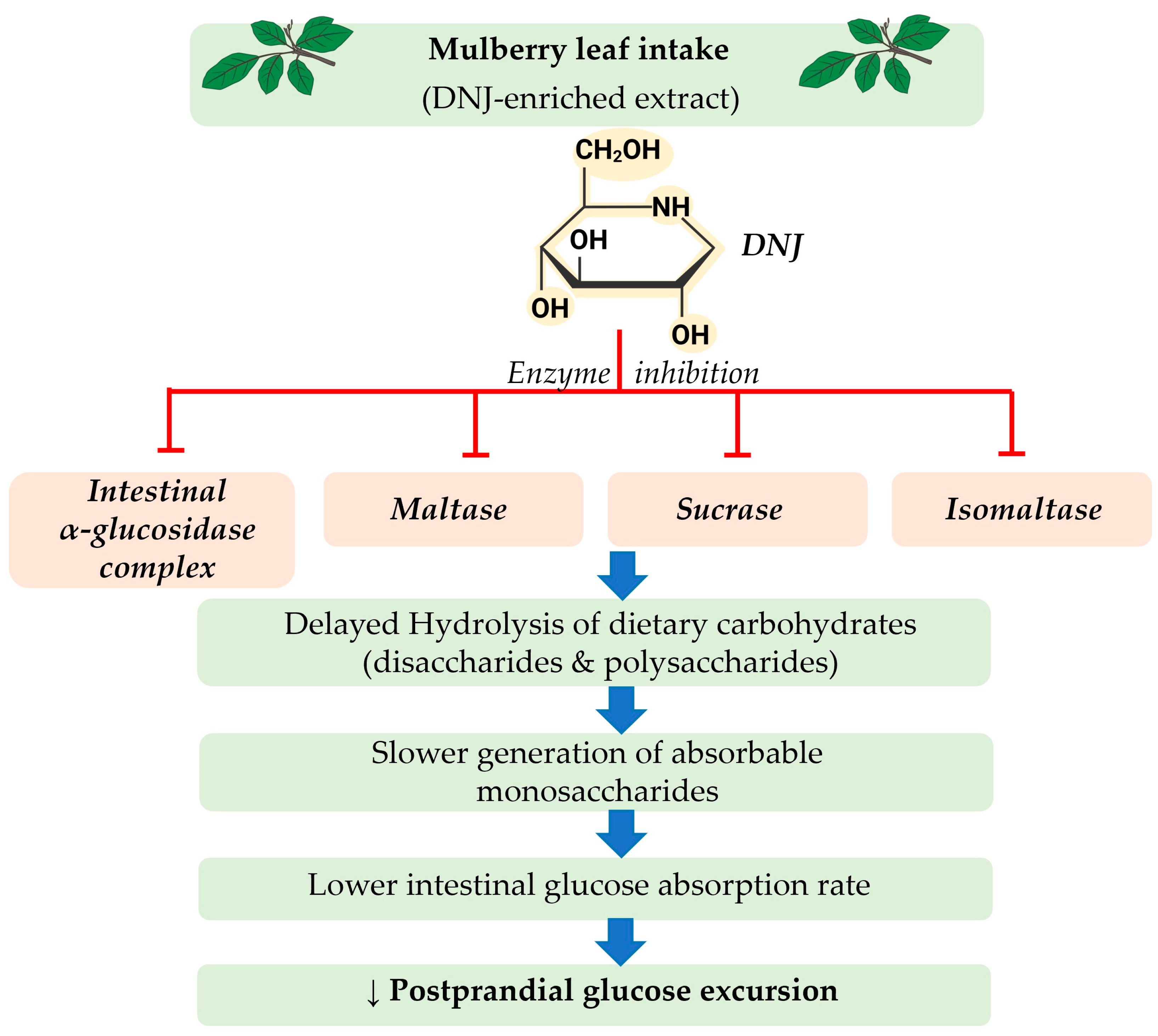 - Asai, A.; Nakagawa, K.; Higuchi, O.; Kimura, T.; Kojima, Y.; Kariya, J.; Miyazawa, T.; Oikawa, S. Effect of mulberry leaf extract with enriched 1-deoxynojirimycin content on postprandial glycemic control in subjects with impaired glucose metabolism. J. Diabetes Investig. 2011, 2, 318–323. [Google Scholar] [CrossRef]