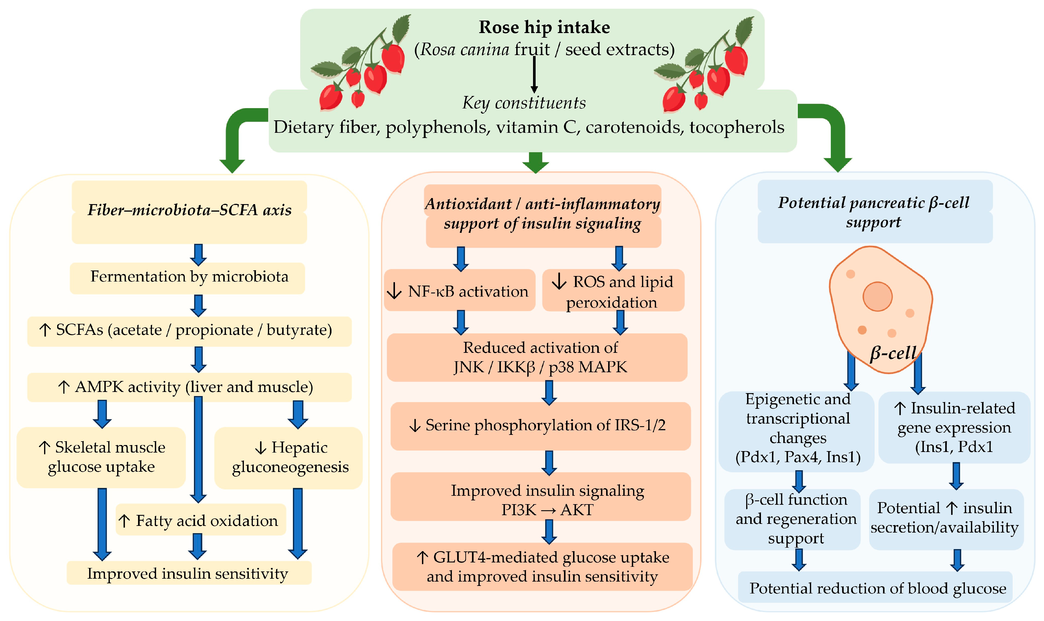 | Rosa canina | ✔ enzyme inhibition | ◐ β-cell protection | ✔ indirect | ◐ | ✖ | ✔✔✔ dominant | ✔✔ fiber-mediated |