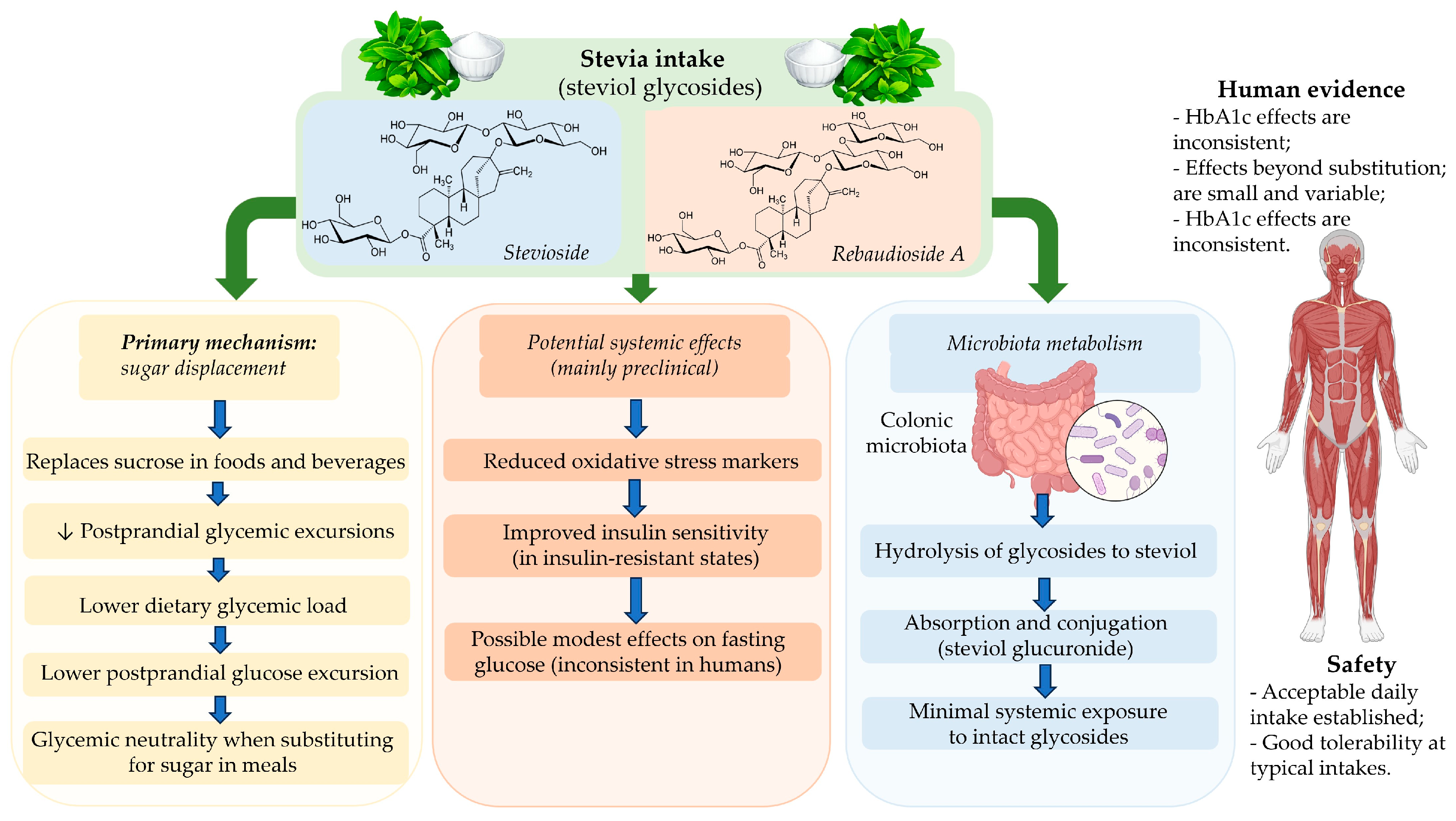- Anker, C.C.B.; Rafiq, S.; Jeppesen, P.B. Effect of Steviol Glycosides on Human Health with Emphasis on Type 2 Diabetic Biomarkers: A Systematic Review and Meta-Analysis of Randomized Controlled Trials. Nutrients 2019, 11, 1965. [Google Scholar] [CrossRef]