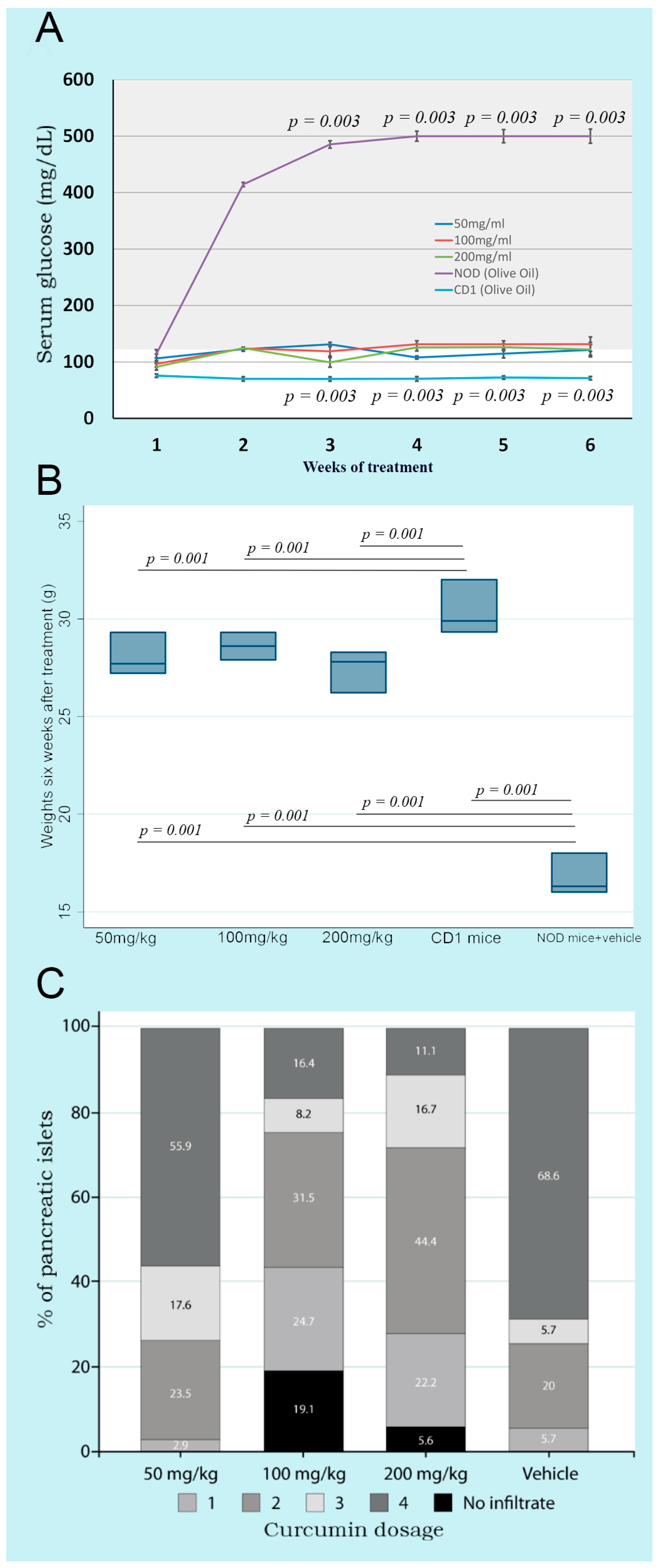3.1. Three Different Doses of Curcumin Delay Serum Glucose Elevation in Non-Obese Diabetic Mice
